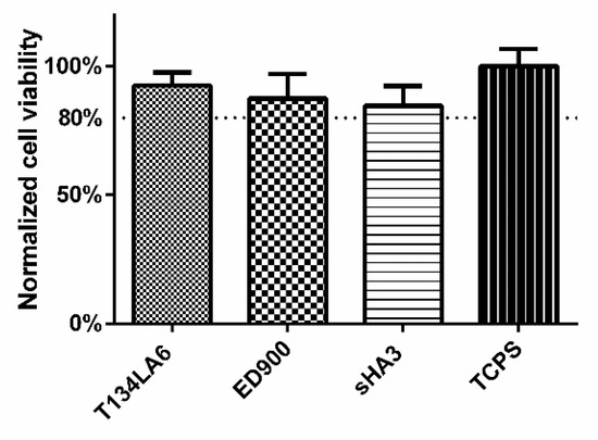 We investigated cytocompatibility by direct culture of L929 fibroblasts on sHA3 and control surfaces. The WST-8 assay revealed a cell viability > 80% for all modifications of the films (Figure 8).