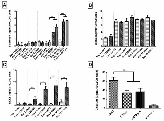 DKK1 as another relevant Wnt antagonist was found to increase on control surfaces starting on day 3. The amounts of DKK1 remained significantly lower in the supernatant of cells seeded on sHA3 films than on control films until the end of our experiment (Figure 9C). The quantification of Wnt3a in the supernatants, however, showed no significant differences between covalently sHA3 functionalized materials and the ED900 control (Figure 9B). As a marker for osteogenic differentiation, we determined the amount of calcium on day 10. Normalized calcium content of the sHA3 group was significantly higher in comparison to all controls (Figure 9D).