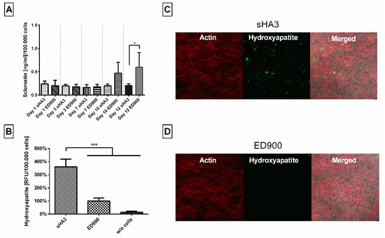 In order to investigate the films with human primary cells, we differentiated hMSC on the film surfaces. Here, we determined significant differences in sclerostin in the supernatant of sHA3 and ED900 groups (Figure 10A) on day 12. Mineral deposition was chosen as a marker for osteogenic differentiation and detected with the hydroxyapatite specific OsteoImageTM staining. Qualitative (Figure 10C,D) and quantitative (Figure 10B) assessment showed significantly higher fluorescent signal and thereby hydroxyapatite content on the sHA3 films.
