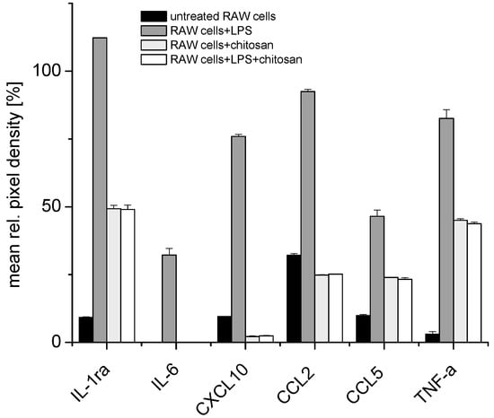 A cytokine array revealed increasing levels of pro-inflammatory cytokines, such as TNF-α, IL-1β and IL-6 and chemokines such as CCL5 (RANTES), CXCL2 (MIP-2α) and CCL2 (MCP-1) in RAW 264.7 cells after stimulation with LPS for 24 h, while, conversely, the treatment with 10 µg/mL chitosan with or without prior LPS led to a reduction in the levels of pro-inflammatory cytokines, such as TNF-α, IL-1β and IL-6 and chemokines such as CCL5 (RANTES) or CCL2 (MCP-1), after stimulation with 1 µg/mL of LPS for 24 h. Figure 1 shows that IL-1ra, IL-6 and TNF-α are only expressed after LPS stimulation in RAW 264.7 macrophages. IL-10, which was also expressed after LPS stimulation, is known to exert an anti-inflammatory effect to restore the exaggerated immune response back to its normal state. These studies revealed that it would be logical to investigate the concentration of TNF-α, IL-6 and IL-1β as representative pro-inflammatory cytokines produced by RAW 264.7 cells during further studies. In addition, the production of granulocyte–macrophage colony-stimulating factor (GM-CSF) was reduced in the presence of chitosan.