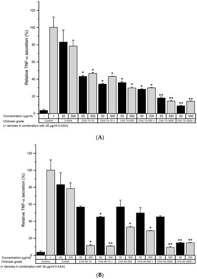 Tumor necrosis factor-α (TNF-α) secretion from LPS-stimulated RAW 264.7 cells after incubation with 30 and 300 µg/mL of chitosan 70% (A) and 95% (B) degree of deacetylation (DD) and viscosity 10, 500 and 3000 mPas for 24 h in serum-free medium (−): healthy control, (+): untreated colitis control (mean ± SD; n = 6; * p < 0.05; ** p < 0.01 compared to the 5-amino salicylic acid (5-ASA) 30 µg/mL control, Mann–Whitney test).