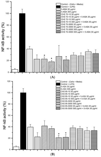 Nuclear factor kappa-B (NF-κB) activity from LPS-stimulated RAW 264.7 macrophages (1 µg/mL) after 24h treatment with 30 µg/mL and 300 µg/mL of chitosan 70% (A) and 95% (B) DD and viscosity 10 and 3000 mPas and in combination with 30 µg/mL 5-ASA (n = 6; data given as mean ± S.D., * = p < 0.05 compared to 5-ASA 30 μg/mL alone).