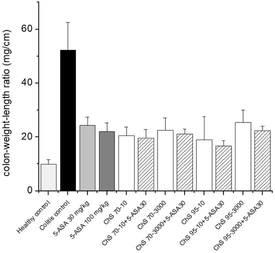 Determination of colon weight length ratio after treatment of experimental colitis (90 mg/kg 2,4,6-trinitrobenzenesulfonic acid (TNBS)) with 30 mg/kg chitosans of different DD (70% and 95%) and viscosities (10 and 3000 mPas) in combination with 30 mg/kg 5-ASA (mean ± SD; n = 5; chitosan receiving groups did not differ significantly from 5-ASA 30 mg/kg, Dunnett’s test).