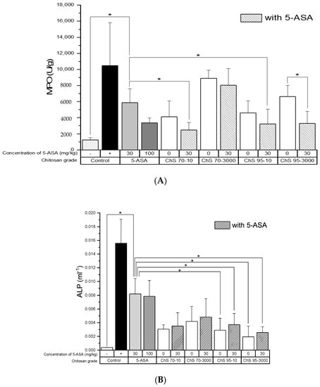 Generally, ALP showed a comparable trend, i.e., levels in the treatment groups were significantly reduced compared to the untreated colitis control, except for the 5-ASA alone group (Figure 5B). Similarly, compared to the 5-ASA control group, the observed trend was a significant reduction in ALP levels in the groups treated with ChS-95-3000 and ChS-95-3000 + 5-ASA, respectively, as well as for ChS-70-10 + 5-ASA, while all other groups had lowered ALP levels, but not significantly.