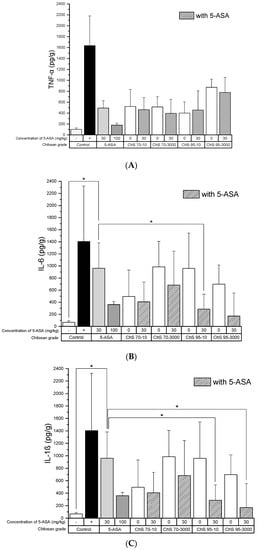 (A) TNF-α, (B) interleukin-6 (IL-6), (C) IL-1β activity in colon tissue homogenates after treatment of experimental colitis (90 mg/kg TNBS) with 30 mg/kg chitosans of different DD (70% and 95%) and viscosities (10 and 3000 mPas) in combination with 30 mg/kg 5-ASA, (−): healthy control, (+): untreated colitis control (mean ± SD; n = 5; * p < 0.05; Dunnett’s test.).