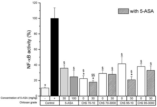 NF-κB activity in colon tissue homogenates after treatment of experimental colitis (90 mg/kg TNBS) with 30 mg/kg chitosans of different DD (70% and 95%) and viscosities (10 and 3000 mPas) in combination with 30 mg/kg 5-ASA, (−): healthy control, (+): untreated colitis control (mean ± SD; n = 5; * p < 0.05 compared to 5-ASA 30 mg/kg, § p < 0.05; §§ p < 0.01 compared to colitis control, Dunnett’s test.).
