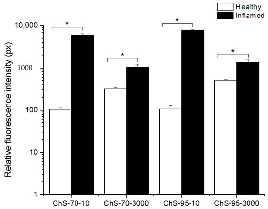 Fluorescence intensity in inflamed tissue for chitosans ChS-70-10, ChS-70-3000, ChS-95-10 and ChS-95-3000 (mean ± SD; n = 3; * p < 0.05; healthy tissue compared to inflamed tissue for each chitosan).
