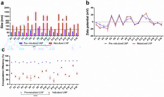 Stability of LNP formulations before and after nebulization in terms of (a) size, (b) zeta-potential, and (c) encapsulation efficiency. The size (*** p = 0.0004) and encapsulation efficiency (**** p < 0.0001) of nebulized formulation were significantly different from pre-nebulized formulations.