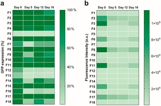 Efficiency of intracellular protein expression in HEK-293 cells over 16 days after LNP preparation. (a) percent GFP expression, and (b) fluorescence intensity.