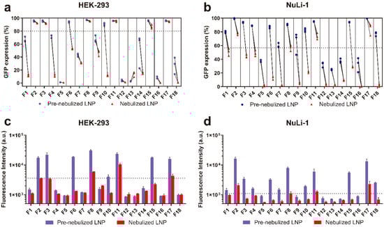 The intracellular protein expression of pre- and post-nebulized LNP mRNA formulations was assessed using flow cytometry by measuring percent GFP expression and fluorescence intensity in HEK-293 and NuLi-1 cell lines. On day 0 (i.e., incubation same day as preparation of formulations), we measured the intracellular protein expression of each mRNA-encapsulated formulation in HEK-293 cells to identify formulations that exhibited higher transfection than the reference formulation (DLin-MC3-DMA: DSPC: cholesterol: PEG-DMG = 50: 10: 38.5: 1.5, N/P = 15). It was found that most formulations showed over 50% GFP expression, except F5, F12, and F13. Notably, although most formulations had relatively high percent GFP expression, the intracellular protein expression in terms of fluorescence intensity varied among the formulations. Eight out of 18 formulations (F2, F3, F4, F6, F8, F11, F15 and F17) showed a significantly higher fluorescence intensity compared to the reference formulation, which showed a mean fluorescence intensity of 6708 a.u. in HEK-293 cells on Day 0. The percent GFP expression of these eight formulations were as high as over 95% and showed no significant differences when compared to the reference formulation. Next, the shelf stability of LNPs was tested by quantifying their intracellular protein expression after 0, 5, 12, and 16 days of refrigerated storage. As shown in Figure 2a, eight formulations (F2, F3, F6, F8, F10, F11, F15 and F17) remained stable in terms of percent GFP expression after 16 days of storage at 4 °C. In contrast, the fluorescence intensity of all formulations decreased significantly after 5 days of storage at 4 °C (Figure 2b). Specifically, F2, F3, F6, F8, F11, F15, and F17 showed fluorescence intensities of over 18,000 a.u. which were significantly higher than the reference formulation after 16 days of storage.
