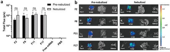 Delivery efficacy of F2, F8, F11, F17 formulations with luciferase mRNA. (a) Efficacy of the four lead formulations before and after nebulization in lung as measured in total flux of luminescence 6 h after intratracheal delivery of 1.5 µg of total mRNA. (b) Representative images of the luciferase expression in the lungs, heart, liver, and kidneys measured by in vivo imaging system (IVIS) imaging.