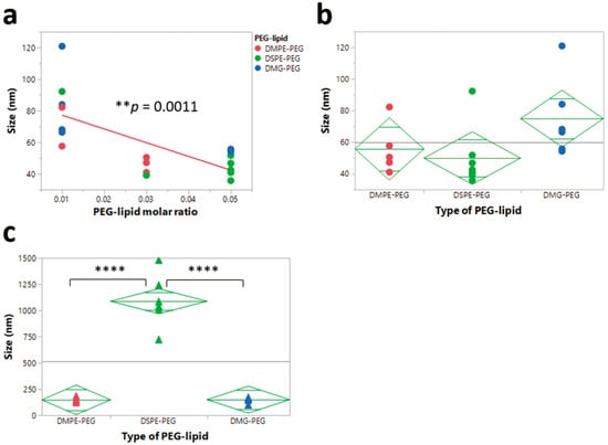 Correlation between particle size and poly-(ethylene) glycol (PEG)-lipid. (a) Effects of PEG-lipid molar ratio on particle size before nebulization. (b) Effects of type of PEG-lipid on particle size before nebulization (c) Effects of type of PEG-lipid on particle size after nebulization. (** p < 0.01, **** p < 0.0001).