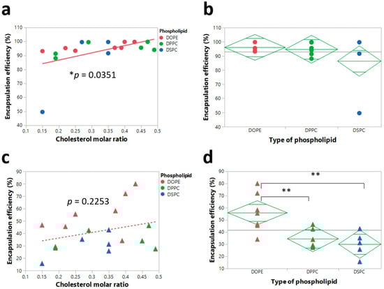 Correlation of encapsulation efficiency and cholesterol molar ratio and type of phospholipid. (a) Significant correlation (* p < 0.05) between encapsulation efficiency and cholesterol molar ratio before nebulization. (b) No significant effects (p > 0.05) of type of phospholipid on encapsulation efficiency before nebulization. (c) No significant correlation between encapsulation efficiency and cholesterol molar ratio after nebulization. (d) Significant effects of type of phospholipid on encapsulation efficiency after nebulization. ** p < 0.01.
