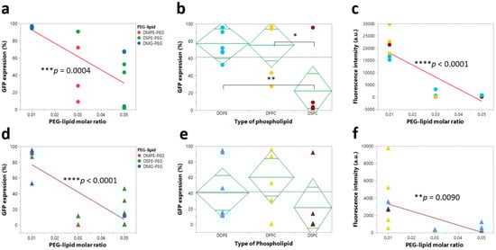Correlation analysis between intracellular protein expression (percent GFP expression and fluorescence intensity) and PEG-lipid molar ratio or type of phospholipid. (a) Significant effect of PEG-lipid molar ratio on percent GFP expression before nebulization. (b) Significant effect of type of phospholipid on percent GFP expression before nebulization. (c) Significant effect of PEG-lipid molar ratio on fluorescence intensity before nebulization. (d) Significant effect of PEG-lipid molar ratio on percent GFP expression after nebulization. (e) No significant effect of type of phospholipid on percent GFP expression after nebulization. (f) Significant effect of PEG-lipid molar ratio on fluorescence intensity after nebulization (* p < 0.05, ** p < 0.01, *** p < 0.001, and **** p < 0.0001).