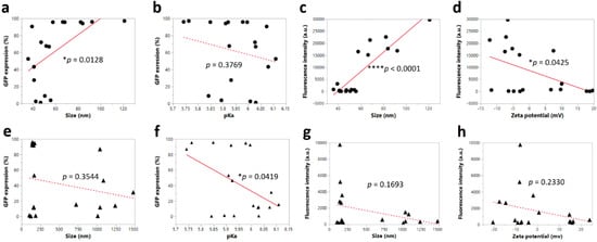 Orthogonal trends of intracellular protein expression in terms of percent GFP expression and fluorescence intensity, whereby dotted line represented non-significance and solid line represented significance. (a–d): Correlation between intracellular protein expression and formulation properties before nebulization. (e–h): Correlation between intracellular protein expression and formulation properties after nebulization (* p < 0.05, and **** p < 0.0001).