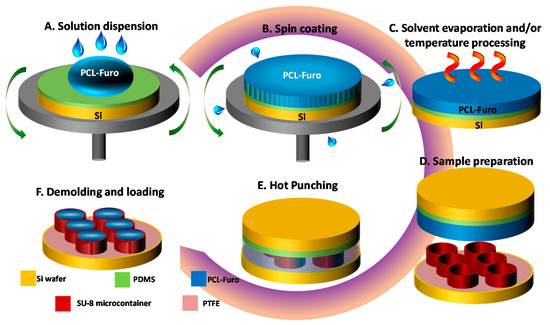 (A–C) Spin coating process: (A) Poly-ε-caprolactone (PCL)-Furosemide (Furo) solution dispersion on Polydimethylsiloxane (PDMS)-coated Si wafer, (B) spin coating at 500 rpm, (C) heating of the spin-coated PCL-Furo film. (D–F) Hot punching process for loading of spin-coated PCL-Furo films in SU-8 microcontainers: (D) sample preparation including the spin coating of a double layer of PCL-Furo solution and stacking of SU-8 microcontainers wafer and PCL-Furo wafer, (E) hot punching, (F) completed loading of the spin-coated PCL-Furo film in the SU-8 microcontainers after peeling of punched PCL-Furo film between the devices.
