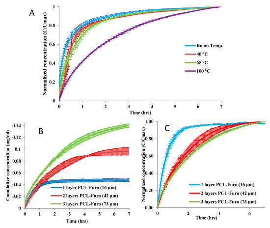 The release studies (Figure 2A) showed that the release rate was lower for higher temperature, significantly declining for the film heated at 100 °C. As expected, the thicker films release more furosemide as they contain larger amounts of the drug (Figure 2B). Considering the release rate, one-layered PCL-Furo films showed fast release with almost 80% of the drug released within the first 60 min, while the release from two-layered and three-layered films was much slower (Figure 2C). PCL is a hydrophobic polymer with very slow degradation time. Furthermore, no signs of swelling or erosion in aqueous medium were observed for a duration of 5 h. This implies that the release of furosemide occurred mainly due to diffusion through the matrix. Thus, it is expected that the furosemide release from the spin-coated PCL matrix should represent time-dependent Fickian release profiles, such as the ones in Figure 2. Brophy and Deasy [17] have investigated in depth the diffusion-based drug release from polymer matrices for up to 5–8 h of dissolution time and observed similar time-dependent release profiles.