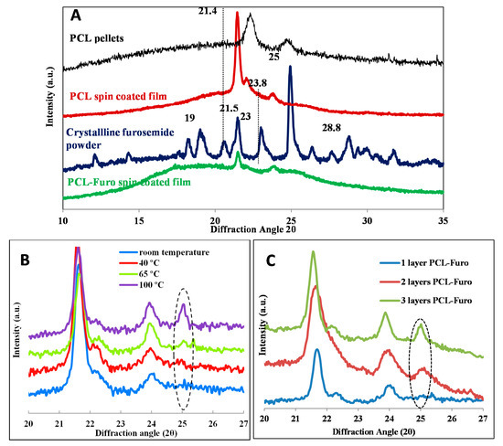 To further investigate and validate the release profiles, X-Ray Powder Diffraction (XRPD) was performed. In Figure 3A, as-purchased crystalline furosemide powder shows five characteristic peaks at 19°, 21.5°, 23°, 25° and 28.8° 2θ angles, similar to ones seen in Matsuda and Tatsumi [18], confirming that the drug indeed is in its crystalline form I. The most distinct peak was found at 25°. The spin-coated PCL films displayed two main peaks at 21.4° and 23.8° 2θ angles. These match with the peaks reported in Bittiger et al. [19] for PCL films produced by spin coating of PCL solution in DCM. It should be noted that there is a significant sharpening and shift of the peaks for the PCL film as compared to the peaks for the PCL pellets. This is due to the presence of residual stress in the spin-coated PCL film, as elaborated in the notes from Hutchinson [20]. The PCL-Furo film in Figure 3A shows two peaks matching the ones for PCL. Absence of furosemide peaks indicates that furosemide is present in an amorphous form in the film after the spin coating of the drug-polymer matrix. The reason for the amorphous state of furosemide is probably the fast solvent evaporation during spin coating, which basically quenches furosemide in the polymer matrix, as also observed by Van Eerdenbrugh and Taylor [21]. It has previously been shown by Nielsen et al. [22] that a stable amorphous furosemide-polymer solid dispersion can be obtained by spray-drying, increasing the solubility and dissolution rate of furosemide. Figure 3B demonstrates that the main furosemide peak at around 25° increases in its intensity and becomes sharper as the annealing temperature is increased. This implies that there is an increase in the crystallinity of furosemide at higher temperature, which explains the slower drug release for these samples reported in Figure 2.