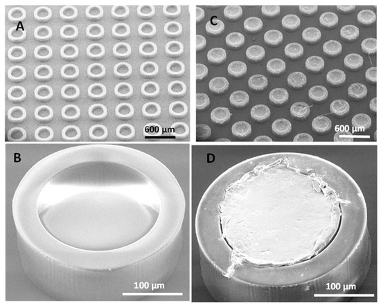 SEM micrographs of: (A,B) empty SU-8 microcontainers, and (C,D) high-throughput loading of SU-8 microcontainers with PCL-Furo matrix using optimized process parameters.