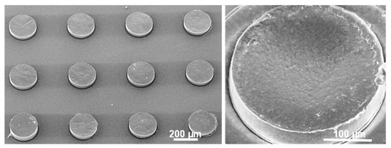 In order to evaluate the effect of physical confinement of the drug on the release profile from the PCL-Furo-loaded SU-8 microcontainers, PCL-Furo micro-disks with the same dimensions as PCL-Furo loaded in microcontainers were used as control. These micro-disks were prepared similar to the drug polymer matrix loaded in microcontainers. However, an ozone plasma treatment of PDMS layer for 20 min before spin coating and hot punching, similar to the one performed in Petersen et al. [23], was introduced, changing the surface energy of PDMS from 6 to 72 mN/m−1. Due to the higher surface energy of the treated PDMS layer, the punched PCL-Furo matrix remains attached to the underlying PDMS layer after the demolding of the SU-8 microcontainers (Supplementary Materials, Figure S6), forming PCL-Furo micro-disks, as shown in Figure 5.