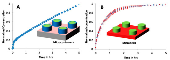 Release of Furosemide from (A) PCL-Furo matrix loaded into SU-8 microcontainers, and (B) PCL-Furo micro-disks. The release was performed in 10 mM phosphate buffer at pH 7.4.
