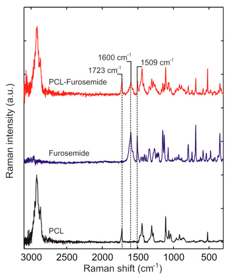 In order to understand the zero-order controlled release of furosemide from the microcontainers, Raman spectroscopy was used to analyze the distribution of drug embedded in the PCL matrix loaded into the microcontainers. In Figure 7, a reference spectrum of furosemide was measured where two distinct furosemide peaks at 1600 and 1509 cm−1 can be observed, confirming that furosemide powder (without processing) is in polymorph I form (the most stable). The peaks depicted here match with the furosemide peaks mentioned in Matsuda et al. [25]. The main peak of PCL in the Raman spectrum to which the furosemide peaks were compared to was at 1723 cm−1. Kister et al. [26] assign this PCL peak to νC=O stretching mode. As can be seen in Figure 7, the main peaks of furosemide are present in the PCL-Furo matrix loaded in SU-8 microcontainer, showing that embossing at 65 °C temperature and 1 bar pressure did not modify the drug.