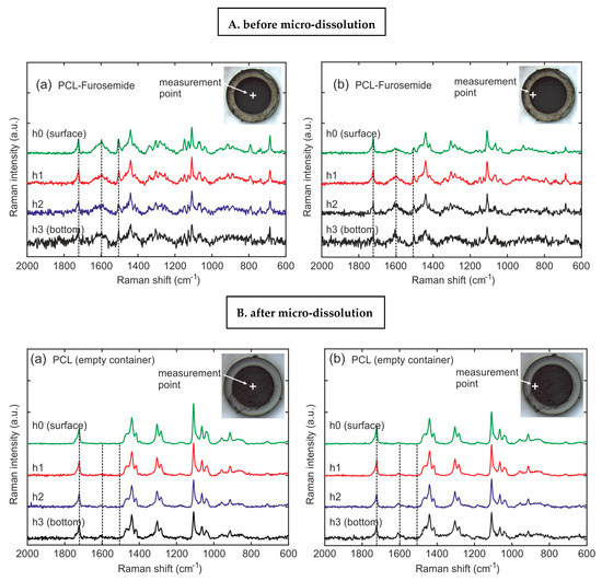 Figure 8B(a,b) show the Raman spectra of PCL-Furo-loaded microcontainers after 5 h of release measured in the center and at the edge of the microcontainer reservoir at four different depths. The overall decrease in the intensity of furosemide peaks after micro-dissolution compared to the peaks before demonstrates that the drug was released in the media. At the same time, the Raman spectra depict that after 5 h of release, there was a higher amount of drug remaining at the bottom of the reservoir than at the top surface.