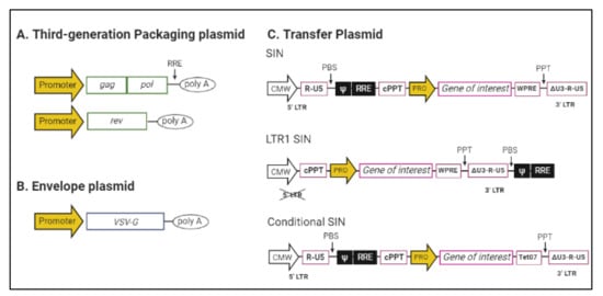 - Sanber, K.S.; Knight, S.B.; Stephen, S.L.; Bailey, R.; Escors, D.; Minshull, J.; Santilli, G.; Thrasher, A.J.; Collins, M.K.; Takeuchi, Y. Construction of Stable Packaging Cell Lines for Clinical Lentiviral Vector Production. Sci. Rep. 2015, 5, 9021. [Google Scholar] [CrossRef]