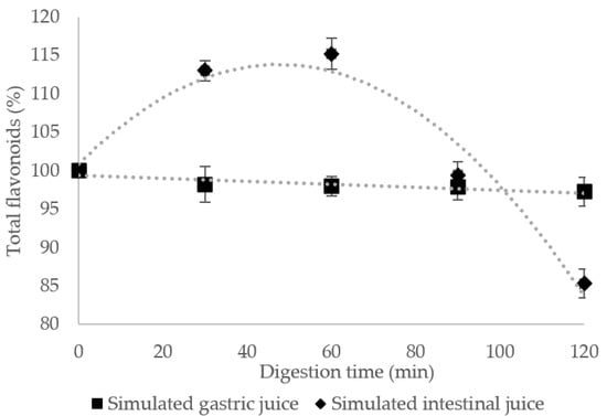 It is often mentioned that microencapsulation is designed to improve the bioavailability of bioactive compounds []. Due to the structural particularities and the interaction between flavonoids, digestive enzymes and dietary components from the diet, the bioavailability of flavonoids in different stages of digestion, absorption and distribution is considered low []. In order to evaluate the effect of the coatings on the flavonoid behavior throughout the gastro-intestinal tract, an in vitro simulated study was undertaken, and results are discussed related to the structure–activity relationship at every stage during digestion. The results obtained for in vitro digestibility under simulated gastric (SGF) and intestinal fluids (SIF) show that the coating materials presented a protective effect on the flavonoids release. The sample presented an insignificant decrease (Figure 1) in flavonoids in gastric fluids with approximately 3% after 120 min of gastric conditions, meaning that almost all the bioactive compounds remain encapsulated.