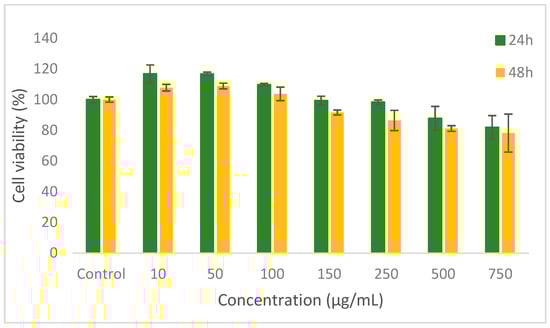 The in vitro cytotoxicity profile and cell viability were evaluated in L929 fibroblast cell culture by NR assay. The results showed that the co-microencapsulated compounds extracted from yellow onion skins did not show a cytotoxic effect up to the 500 μg/mL concentrations, after 24 h and up to the 250 μg/mL after 48 h of cultivation (>80% cell viability) (Figure 2).
