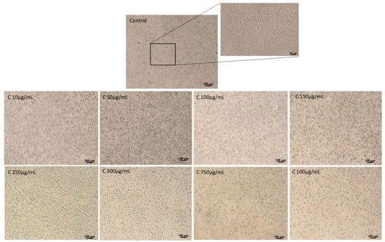 From the images, one can see that the cells treated with the co-microencapsulated powder are similar to the control culture cells, keeping their normal fusiform phenotype, characteristic for fibroblast cells. Additionally, a homogeneous distribution of cells on the culture plate is observed, with a density similar to the control culture. At concentrations of 10–100 µg/mL for powder, the cell density was higher when compared to the control culture. Higher concentrations >750 μg/mL of the vegetal extracts moderately decreased the cell density in treated cultures.