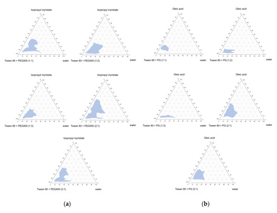 The pseudo-ternary phase diagrams of the microemulsions were constructed using isopropyl myristate or oleic acid as the oil phase. Tween 80 was used as a surfactant and PEG400 or propylene glycol was used as a co-surfactant at a surfactant-to-co-surfactant ratio of 1:1, 1:2, 1:3, 2:1, or 3:1. The pseudo-ternary phase diagrams obtained from these systems are displayed in Figure 2.
