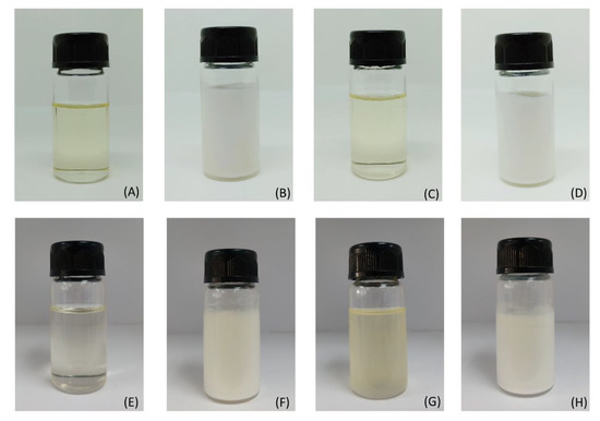 Figure 3. Photographs of the isopropyl myristate and oleic acid microemulsions system. The isopropyl myristate system is shown in the upper row and the oleic acid system is shown in the lower row; microemulsion without drug and hydrogel (A,E); sildenafil citrate dissolved in the microemulsion (B,F); microemulsion-loaded poloxamer 188 (C,G); and sildenafil citrate dissolved in the microemulsion and loaded with poloxamer 188 (D,H).