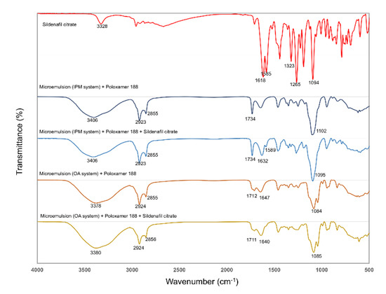 A small amount of the sildenafil citrate powder and microemulsion-loaded hydrogel formulations (from both the isopropyl myristate-based and oleic acid-based systems) with and without sildenafil citrate were ground and mixed into KBr pellets using a small mortar and pestle. The sample with the KBr mixture paste was compressed into tablets using a hydraulic press before the measurement of the infrared (IR) spectrum at the ambient temperature. FTIR spectra were obtained using the PerkinElmer Spectrum One Spectrometer (Perkin Elmer Inc., Waltham, MA, USA). All spectra were collected at room temperature at a resolution of 2 cm−1, and the measurement range was 400–4000 cm−1. The data were processed using the spectrum software of PerkinElmer Spectrum One Spectrometer (Version 5.0.2).