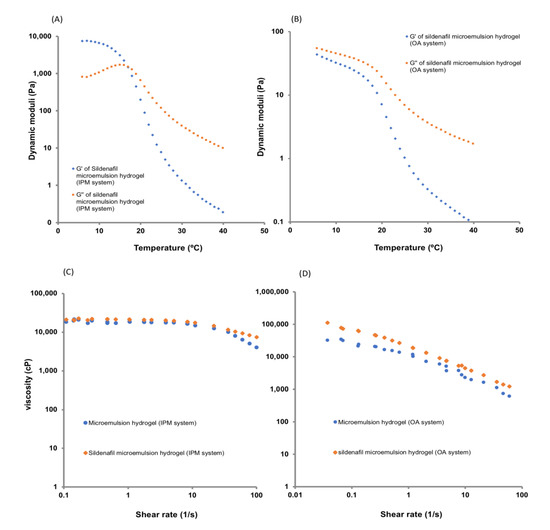 Figure 5. Temperature dependence of the dynamic moduli of isopropyl myristate system (A), and oleic acid system (B); viscosity curve of the sildenafil microemulsion-loaded hydrogels in different formulations of isopropyl myristate system (C), and oleic acid system (D).