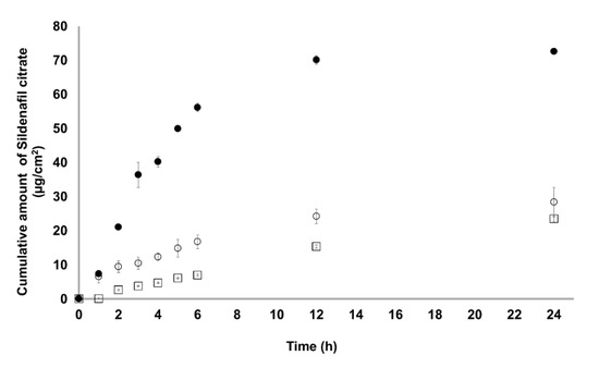 Figure 6. Transdermal permeation of the sildenafil citrate microemulsion-loaded hydrogel (● isopropyl myristate-based system; ○ oleic acid-based system) and sildenafil citrate suspension (⎕) across the Strat-M® membrane in a citrate buffer solution at pH 5.8 (n = 6).