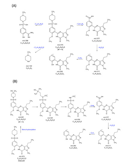 Figure 7. Proposed metabolic pathways of sildenafil citrate (A) and the sildenafil citrate microemulsion-loaded hydrogel (IPM system) (B) from the LC-MS/MS analysis.