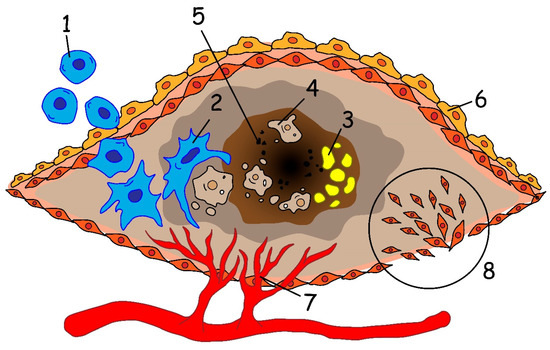 In the early stages of atherosclerosis, low-density lipoproteins (LDL) accumulate in the aortic wall with subsequent oxidation (oxLDL). The accompanying increase in blood pressure leads to the activation of the endothelium, expression of adhesion molecules growth, and to the recruitment of monocytes into the intima [8]. Monocytes further differentiate into macrophages and absorb oxLDL, thereby forming lipid-filled foam cells. Activated macrophages produce cytokines thus promoting the influx of pro-inflammatory cells into the vessel wall. The ability of macrophages to leave the inflammation site is reduced, which leads to their accumulation in the atherosclerotic plaque and adjacent adventitia. Meanwhile, the proliferation of macrophages is significantly increased for both resident and monocyte-derived types [9]. A distinctive feature of the late stages of atherosclerosis is the progressive accumulation of foam cells in the atherosclerotic plaque. Foam cells die mainly due to necrosis and form the “so-called” necrotic core of the plaque. The necrotic core destabilizes the structure of the plaque and promotes its rupture and thrombus formation [10]. According to several autopsy studies, approximately 60% of acute myocardial infarctions occur as a result of the rupture or fissuring of thin-capped fibroatheroma [11].