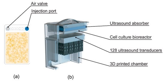 (a) Drawing of cell culture bioreactor (Petaka) used for culturing of cells prior to ultrasound (US) treatment; (b) cutaway of custom-made US treatment chamber used for US treatment of cells (adapted from [22], Pharmaceutics, 2020).