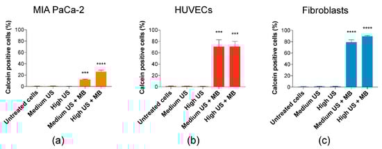The percentage of cells taking up calcein. Addition of MBs was necessary for increased uptake in cells. (a) In MIA PaCa-2, increased US intensity increased the percentage of calcein-positive cells. (b) In human umbilical vein endothelial cells (HUVECs), increased US intensity was not important for percentage of calcein-positive cells. (c) In fibroblasts, increased US intensity resulted in a small increase in percentage of calcein-positive cells. Mean ± SEM; *** p < 0.001, **** p < 0.0001 (treated vs. untreated cells).
