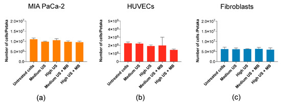 Cell count immediately (0 h) after sonoporation. Cell count (0 h) indicated no mechanical destruction of cells in (a) MIA PaCa-2 and (c) fibroblasts, while a minor and nonsignificant reduction was observed in (b) HUVECs. Mean ± SEM.