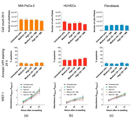 Sonoporation may induce apoptosis [41,42,43,44] and reduce proliferation of cells [4]. Sonoporation at the US intensities in this study had minimal negative effects on the viability of MIA PaCa-2, HUVECs and fibroblasts. In MIA PaCa-2, no increase in percentage of apoptotic cells were observed by Annexin/PI staining (Figure 4a), although a small increase in dead cells at High US (p < 0.05) was observed by Trypan Blue staining in samples taken directly after collecting cells and medium (Figure S6). In HUVECs, apoptosis measured by Annexin V/PI staining increased with increasing US + MBs, but this was not statistically significant (Figure 4b). The uptake of Trypan Blue in HUVECs at these parameters was significantly different from untreated cells (p < 0.01) (Figure S6). In fibroblasts, a very small, but statistically significant (p < 0.05), increase in cell count was observed after 24 h of culturing after sonoporation with Medium US + MBs (Figure 4c).