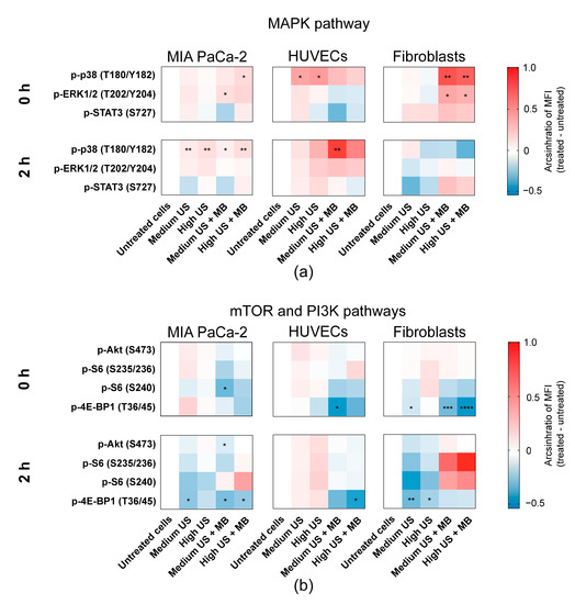 Intracellular signalling induced by sonoporation. Heatmaps displaying changes in phosphorylation status (shown as arcsinh ratio) of the chosen range of proteins in response to treatment with US with and without SonazoidTM MBs. Phosphorylation status was detected immediately (0 h) and 2 h post-sonoporation. Different phosphorylation profiles were observed in the (a) MAP-kinase pathway (p38, ERK1/2 and downstream target STAT3 S727), and (b) mTOR (ribosomal protein S6 and 4E-BP1) and PI3K pathways (Akt). Mean ± SEM. * p < 0.05, ** p < 0.01, *** p < 0.001, **** p < 0.0001 (treated vs. untreated cells).