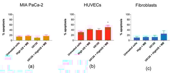 The role of the ERK1/2 activation in response to sonoporation is not yet known, but has been shown to be important for cellular recovery in cells exposed to pore-forming toxins through an intracellular mechanism involving p38 and ERK1/2 (similar to observations in fibroblasts in Figure 5) [45]. Similar to Cabezas et al. [45], we treated cells with MEK/ERK inhibitor U0126 prior to sonoporation, which increased the percentage of apoptotic fibroblasts (from 13% to 26%) and the percentage of apoptotic HUVECs from 43% to 51% (Figure 6), but not at all in MIA PaCa-2. However, the increases were only significant in HUVECs (p < 0.05).