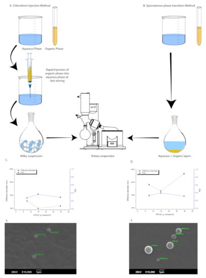 The required quantity of HPCE/Cho/CHCl3 solution was filled in the syringe with a 0.16 d.mm blunt needle. The aqueous phase was adjusted to the prerequisite temperature (25, 35, 45 or 55 °C) with high speed stirring by avoiding vortex formation to prevent the sedimentation and caking of solids at the base of the device. For a 12 mL aqueous volume 1.5, 3 or 6 mL of organic phase was promptly injected just below the surface of the aqueous phase in a 20 mL vial with a 2 cm diameter. The speed of the magnetic stirrer with a 1 cm bar was adjusted at 1000 rpm during the injection step. The mixture was allowed to mix at 10 rpm for next 2–3 min to obtain a uniform suspension. A milky suspension obtained was transferred to the rotary evaporator and allowed to evaporate under reduced pressure (through a 16-psi vacuum pump) at ∟45°, prerequisite temperature and 150 rpm for 20 min. A maximum of half of the rotating flask was occupied to allow sufficient surface area for evaporation.