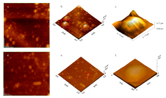 Liposomal stock dispersion after 100× dilution in DW was imaged through atomic force microscopy in amplitude-detection mode (AC-AFM). The stock dispersion contained HPCE/DW 4 µmol/mL and Cho 55.6 mol% of total solids. Liposomes were observed within 5–10 min of deposition on silicon-wafers. The promptness in observation was critical to avoid topographical variations due to substrate–sample interaction and/or environmental effects [40]. Spheroidal vesicles having size-dependent surface-homogeneity signified aptness of the sample preparation method and the scanning technique used (Figure 2). However, a probable stretching effect of the cantilever, sample–substrate interaction and flaccidity of the liposomes lent a difference in observed length to width ratio (Figure 2b,e) [41]. The vesicles maintained their integrity due to lamellar elasticity allowing a slight bend during the scanning process. The observed diameter of the sized vesicles was in accordance with the pore size of the smallest filter-membrane (Table 3). The height of the samples was accorded to the size and rigidity of the samples. A slight difference in the height of the sized samples compared to corresponding unsized vesicles was observed. Mean diameter, height, average surface roughness (Ra) and rigidity were improved by reducing the size of any given sample (Figure 2, Table 3). Surface homogeneity was confirmed from 3D topographic images analysed in the process mode of an inbuilt software (WINSPM 5). The section view and three-dimensional imaging plot indicated a smooth and regular surface profile of the observed liposomes. The surfaces of sized vesicles appeared more uniform than the corresponding unsized samples (Figure 2c,f). In vitro rigidity of liposomes was assessed from the height data of individual vesicles through AC-AFM in combination with Z-av measured after 100x dilution in 10 µM NaCl. The data of Z-av in saline medium resembled the length of vesicles measured through AFM, hence, they were considered suitable to assess rigidity. Comparing various concentrations of HPCE/CHCl3, 15 µmol/mL sized samples showed maximum rigidity of 0.14 ± 0.03, height of 30.58 ± 6.82 nm, Z-av of 149.25 ± 30.2 nm, and roughness of 5.15 ± 1.68 nm. The calculated volume was size-dependent and progressively increased with the decreasing molar concentration of amphiphiles in the organic-phase. However, more uniformity in volumes was observed at HPCE/CHCl3 15 µmol/mL of the unsized vesicles. The majority of the liposomes appeared intact and spheroidal in the obtained images. However, slightly flattened structures were observed due to the flaccid nature of liposomes obvious from their length to height ratio (Table 3 and Figure 2).