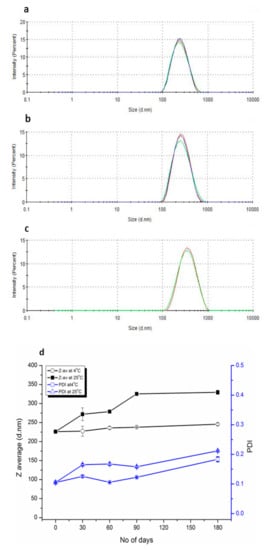 Accelerated stability study of optimized liposomes after sizing by serial membrane filtration with 0.2 µm membrane filter and stored in the primary hydration medium. (a): DLS results at 0-day. (b): DLS results after 180 days at 4 °C. (c): DLS results after 180 days at 25 °C. (d): Z-av and PDI vs. the number of days at 4 °C and 25 °C. The results are presented as mean ± SD.
