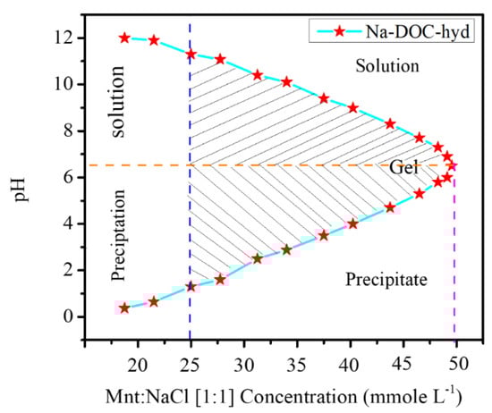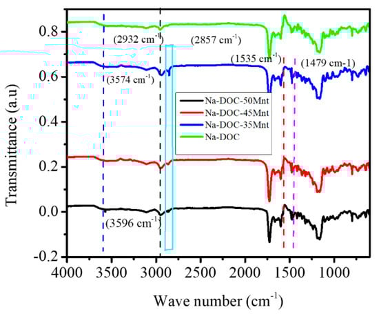 FTIR was used to further study the effect of Mnt on hydrogen bond formation in the gelation process of Na-DOC molecules. The FTIR spectra of the dried samples were recorded by attenuated total reflectance (ATR) spectroscopy (JASCO FTIR-6700; Jasco, Easton, MD, USA).
