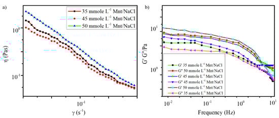 The oscillatory measurements were performed in the frequency range of 10−1–101 Hz to determine the viscoelastic properties of the samples with three different concentrations of Mnt/NaCl. As shown in Figure 3a, the apparent viscosity (η) of the gels also improved with increase in Mnt/NaCl concentration. This showed that the use of 50 mmole L−1 Mnt/NaCl improved the stiffness and viscoelasticity of the gels [,].