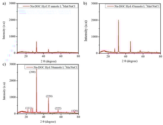 To obtain further information regarding the structural attributes of the hydrogels, we used XRD spectra to assess the self-assembly of the Na-DOC molecules. A previous study indicated that several factors, including the concentrations of the gel modifying and gel cross-linking agents and temperature, determine the nature of the microstructure and the arrangement of Na-DOC molecules during gel formation [] Furthermore, bile salt molecules aggregate in helical, cylindrical, or spherical patterns which are strongly induced as a result of hydrogen bonding and ionic cross-linking []. In the present study, we expected more hydrogen bonding and ionic cross-linking due to the addition of Mnt and NaCl, which enhanced the gelation of the Na-DOC molecules. As shown in Figure 4, the crystallinity of the gel samples was assessed using counts (peaks) obtained from XRD analysis. The nature of the peaks in the XRD study is related to the crystallinity of the samples [,]. As shown in Figure 4c, the gel containing 50 mmole L−1 Mnt/NaCl displayed the highest number of peaks with the highest intensity. The six mean diffraction peaks observed at 27.47, 31.83, 45.54, 56.53, 66.29, and 75.36° were originated from NaCl nanocrystals, which correspond to the (111), (200), (220), (222), (400), and (420) planes, respectively, and the gel showed characteristic peak intensity (counts) of 2724 and 960 at 2θ ≈ 31.8 and 45.5°, respectively. This confirmed that the crystallinity of the hydrogel increased with Mnt/NaCl concentration.